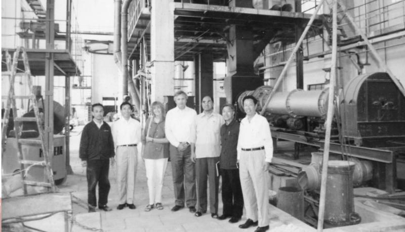1989年,合肥院首臺自主開發(fā)的HRM1250原料立式磨成功投運,各項技術(shù)指標達到或超過設(shè)計要求,填補國內(nèi)空白。該成果于1993年通過建材行業(yè)部級鑒定,達到國際先進水平,隨后榮獲“國家級新產(chǎn)品”、“國家優(yōu)秀節(jié)能科技成果”和國家建筑材料工業(yè)局建材行業(yè)部級科技進步二等獎等一系列榮譽獎勵。圖為技術(shù)人員與院領(lǐng)導(dǎo)在該臺立式磨前合影